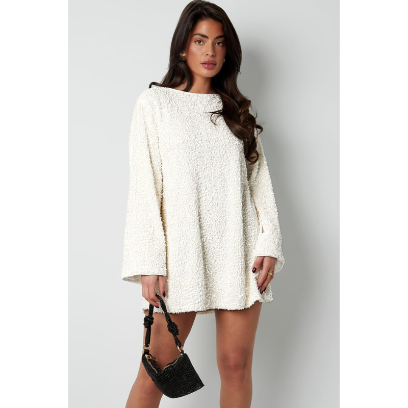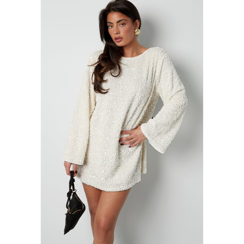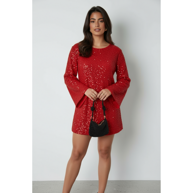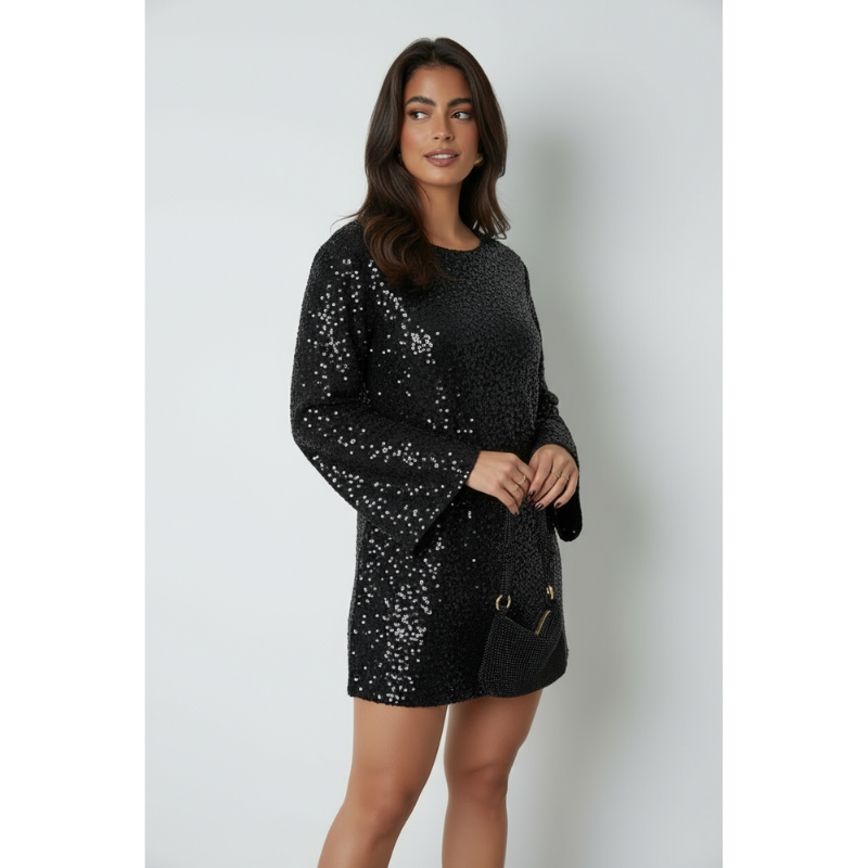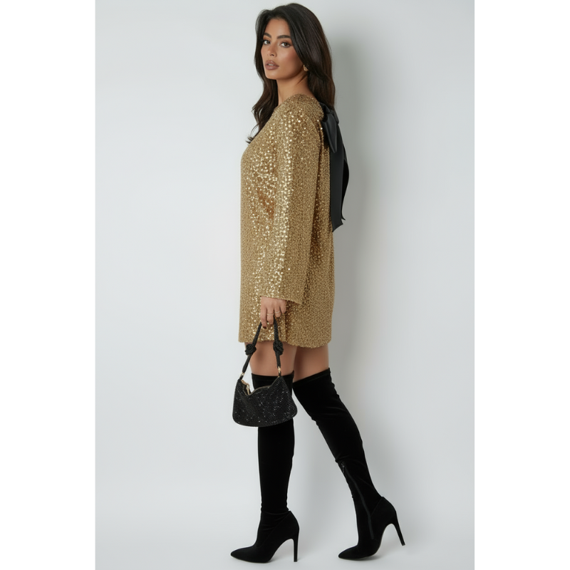 De Glamour Mini Jurk met Pailletten en Satijnen Strik is ontworpen om te stralen zonder overdaad. De fonkelende pailletten geven de jurk een feestelijke uitstraling, terwijl de grote satijnen strik op de rug zorgt voor een elegante en vrouwelijke finishing touch. Een perfecte balans tussen glamour en verfijning, geschikt voor bijzondere momenten.