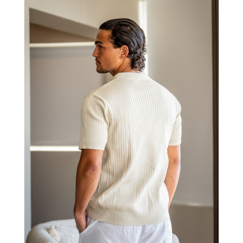 De verticale ribstructuur geeft diepte en karakter aan de polo, terwijl de ontspannen maar gestructureerde pasvorm zorgt voor draagcomfort gedurende de hele dag. De open kraag zonder knopen versterkt de moderne, moeiteloze look. Ideaal om solo te dragen of te combineren met een jasje of overshirt voor extra gelaagdheid.