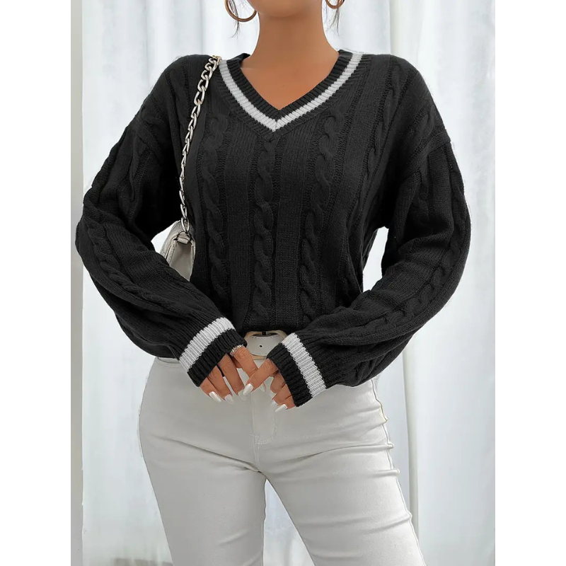 Dames Kabelgebreide Trui met Contrastboord – V-hals