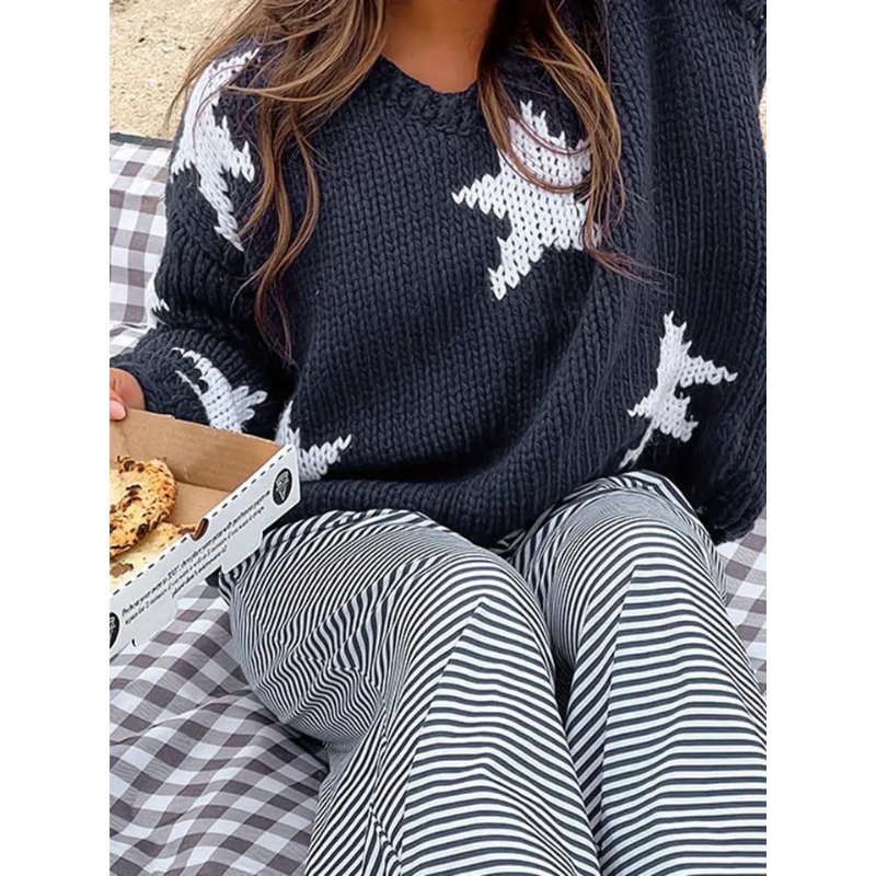 Dames Gebreide Trui met Sterrenmotief – Marineblauw V-hals