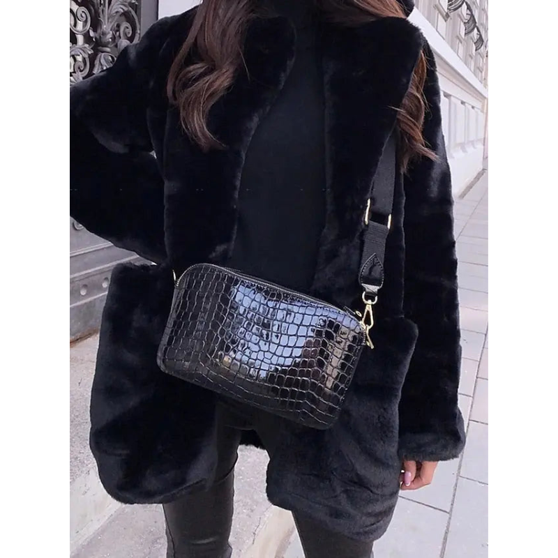 De mantel laat zich moeiteloos stylen: draag hem met een jeans voor een casual maar chique look, of combineer hem met een rok of hakken voor een statement outfit. Vegan-vriendelijk, stijlvol en gemaakt om gezien te worden — perfect voor frisse herfstdagen, winterse stadswandelingen of avondjes uit.