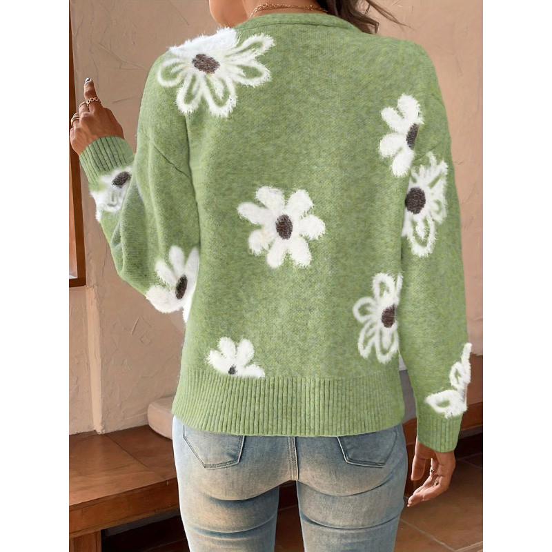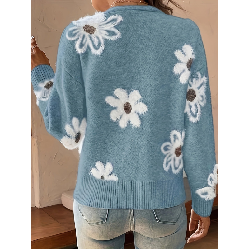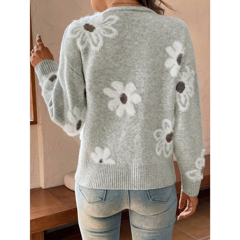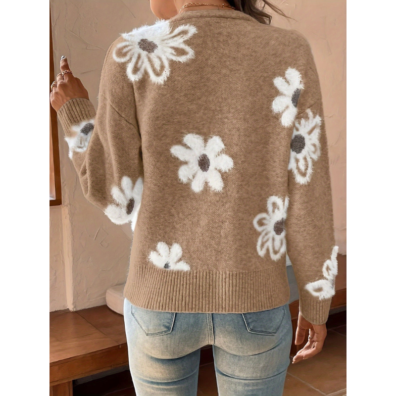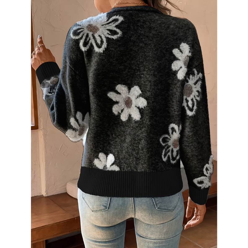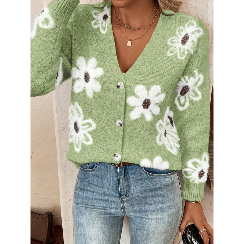 Deze elegante damescardigan met bloemen jacquard patroon is ontworpen voor vrouwen die comfort en stijl moeiteloos willen combineren. Het verfijnde bloemendessin geeft de trui een luxe uitstraling, terwijl het tijdloze ontwerp ervoor zorgt dat hij seizoen na seizoen gedragen kan worden.