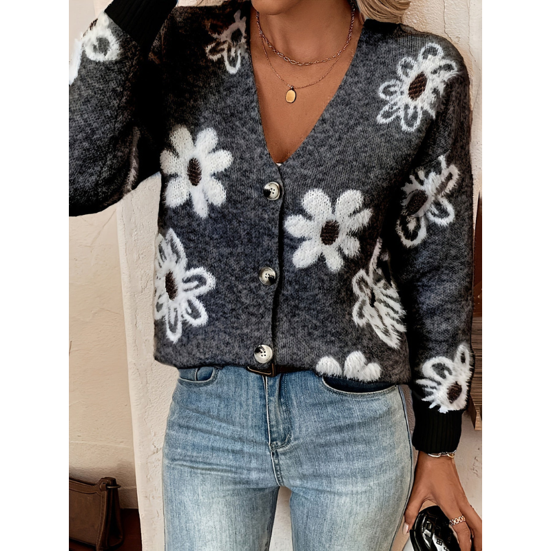 Bloemen Jacquard Cardigan met V-Hals – Dames Katoenmix