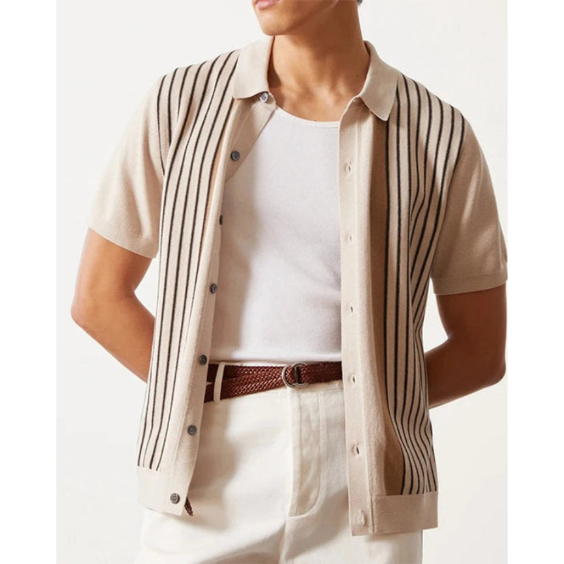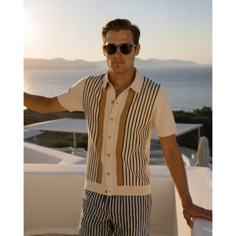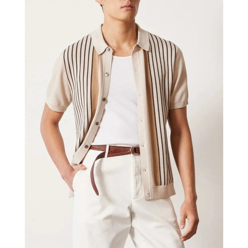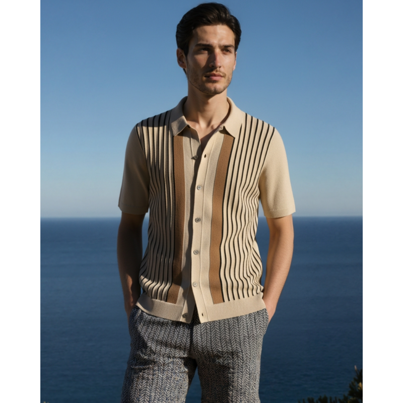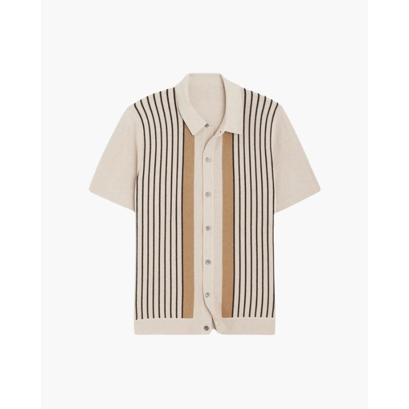 De subtiele verticale strepen in warme, neutrale tinten geven de polo een elegante uitstraling zonder opdringerig te zijn. Dankzij de hoogwaardige breiconstructie draagt de polo comfortabel tijdens warmere dagen en is hij ideaal voor zowel casual als meer verzorgde outfits. De knoopsluiting en gestructureerde kraag zorgen voor een nette afwerking die het geheel in balans brengt.