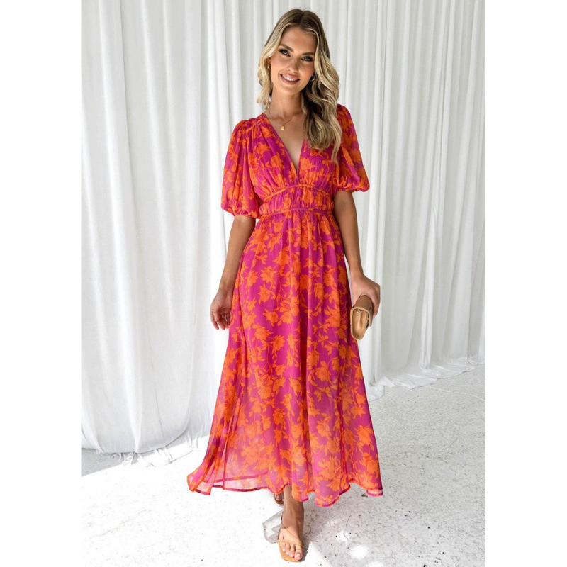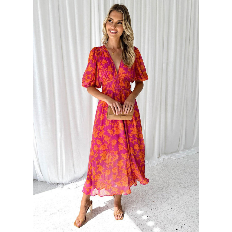 Bloemenprint Midi Jurk met Pofmouwen en V-hals