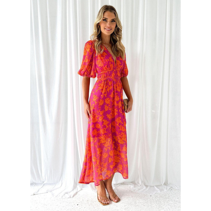 De V-hals zorgt voor een elegante en open uitstraling, terwijl de pofmouwen een verfijnd en karaktervol accent toevoegen. De elastische taille sluit comfortabel aan en accentueert het figuur zonder in te leveren op draaggemak. De all-over bloemenprint versterkt het frisse, zomerse karakter van de jurk.