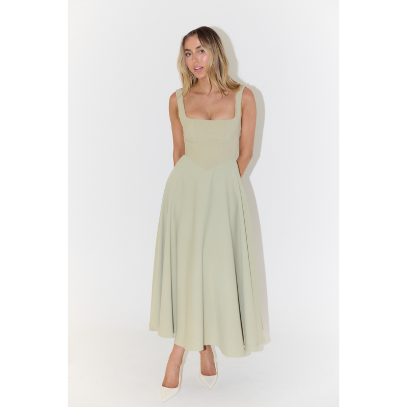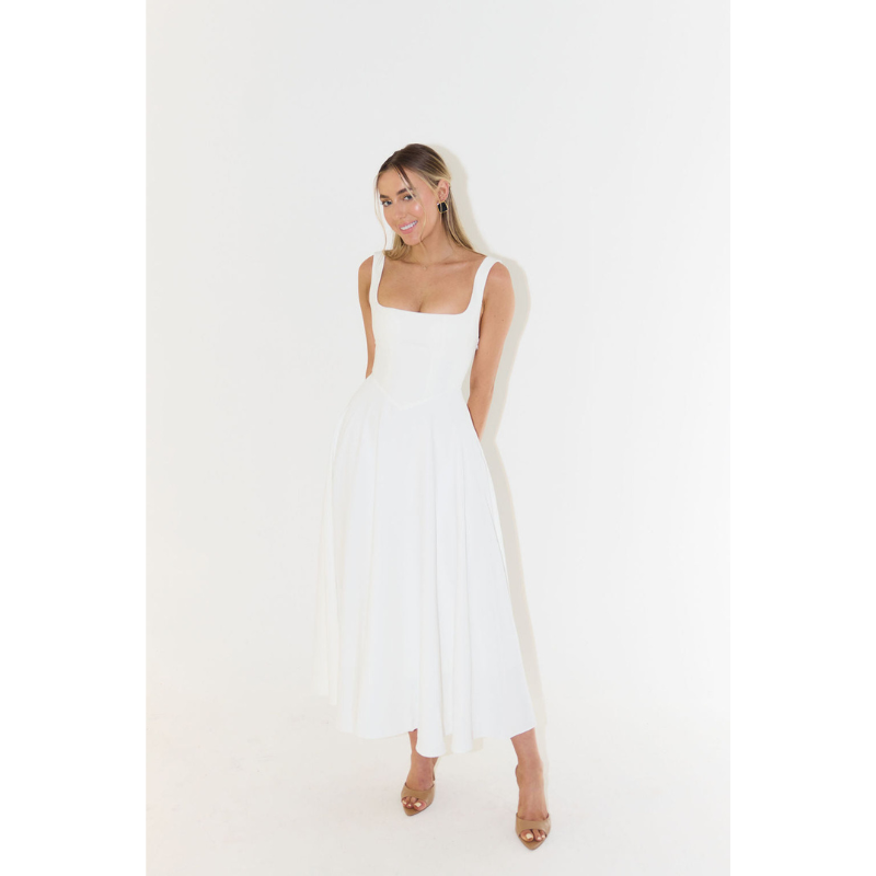 De vierkante halslijn geeft de jurk een strakke, gestructureerde look en accentueert op subtiele wijze de schouders en hals. De midi-lengte valt elegant onder de knie en biedt een comfortabele bedekking zonder zwaar aan te voelen. Dankzij het effen design is deze jurk geschikt voor zowel casual momenten als meer formele zomerevents.