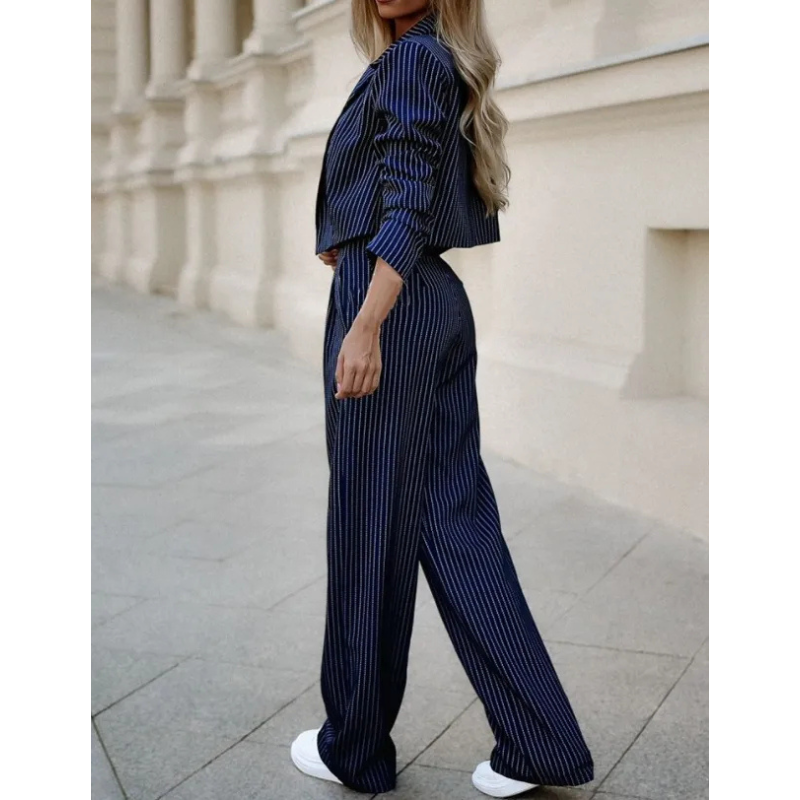 De zachte, soepele stof voelt luxueus aan en biedt volledige bewegingsvrijheid. Dankzij de perfecte pasvorm creëert het pak een elegant silhouet dat moeiteloos aansluit bij de moderne vrouw.